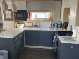 This modern 38x12ft luxury caravan is perfectly situated on Eskdale 47, offering a premium self-catering experience at Primrose Valley. Featuring double front patio doors leading to a large secure decking, it provides the ideal space for families to relax outdoors.